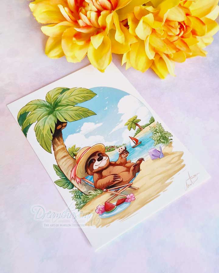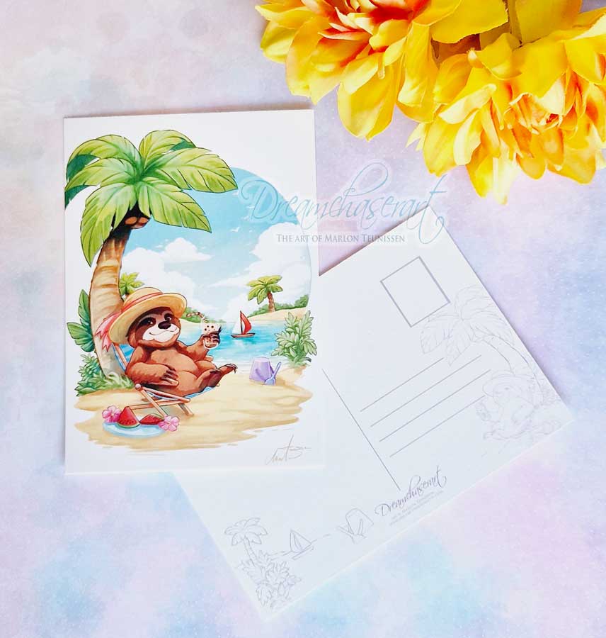 A postcard featuring a sloth chilling on the beach. perfect to send to someone during the summer months.